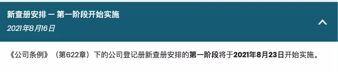 據(jù)香港公司注冊(cè)處8月16日消息,《公司條例》(第622章)下的公司登記冊(cè)新查冊(cè)安排的第一階段將于2021年8月23日開(kāi)始實(shí)施。