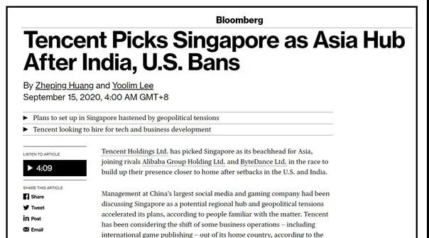 9月15日,繼阿里巴巴、字節(jié)跳動之后,騰訊集團也選擇將進軍亞洲其他地區(qū)的橋頭堡設(shè)立在新加坡。